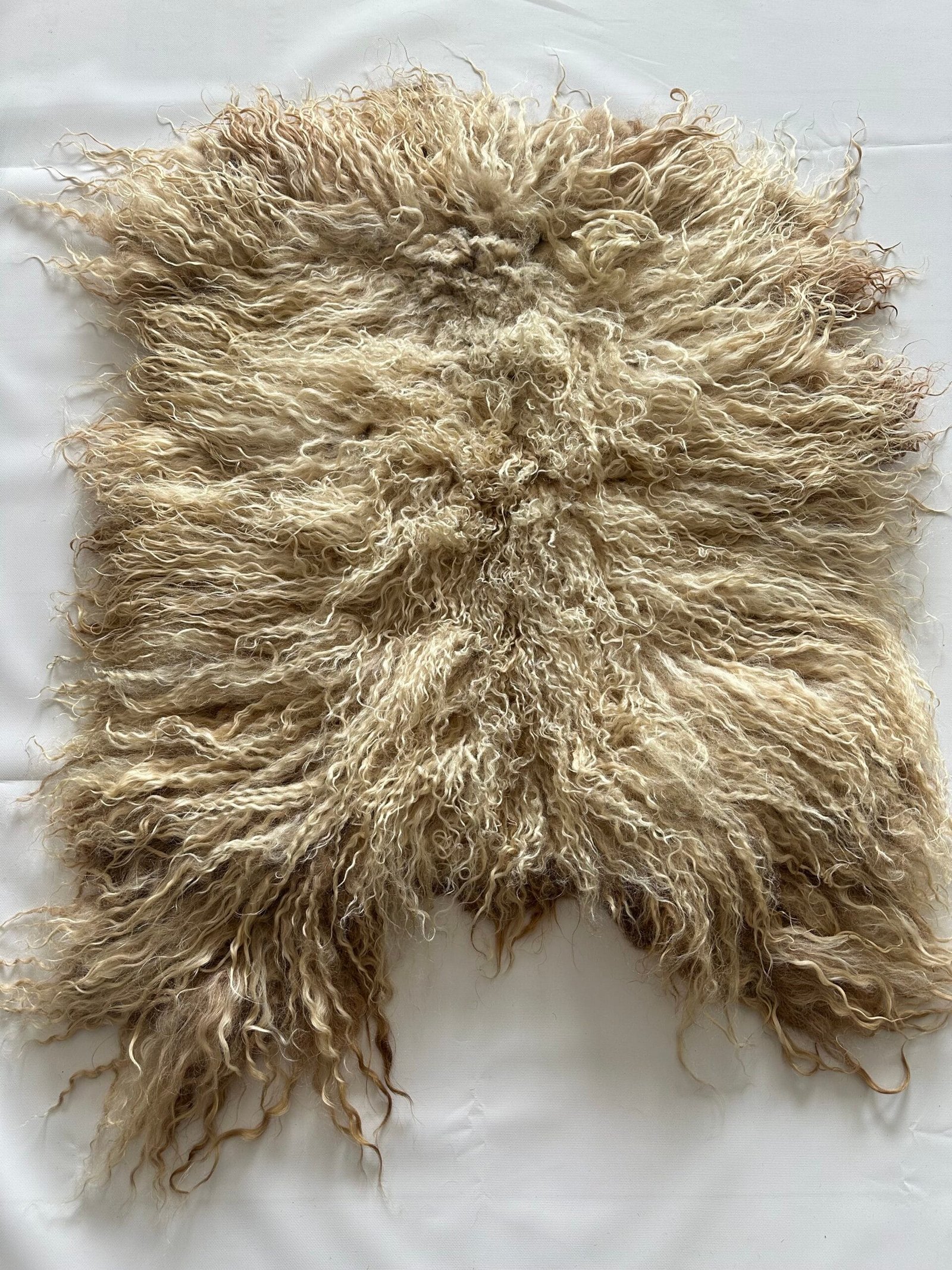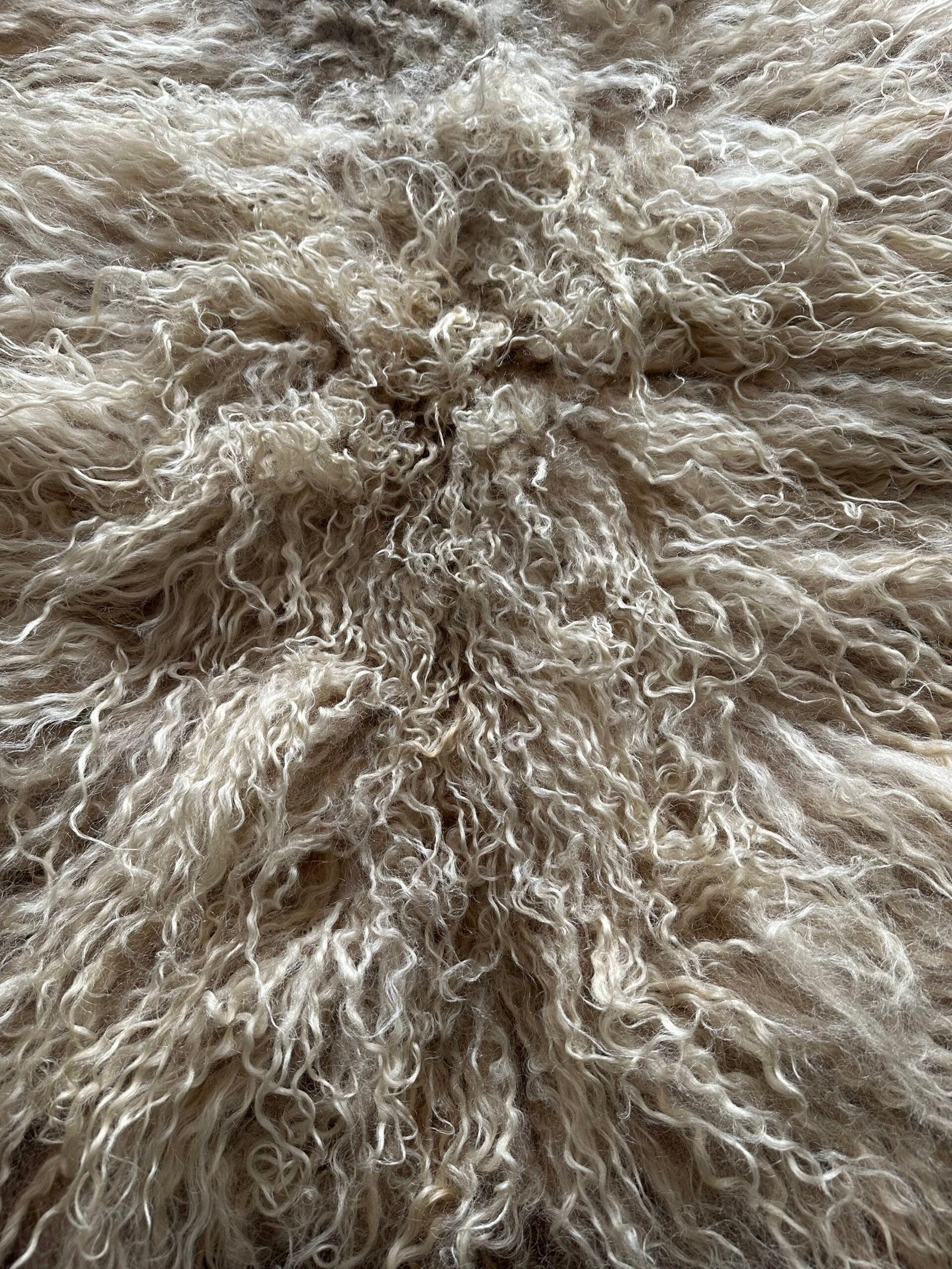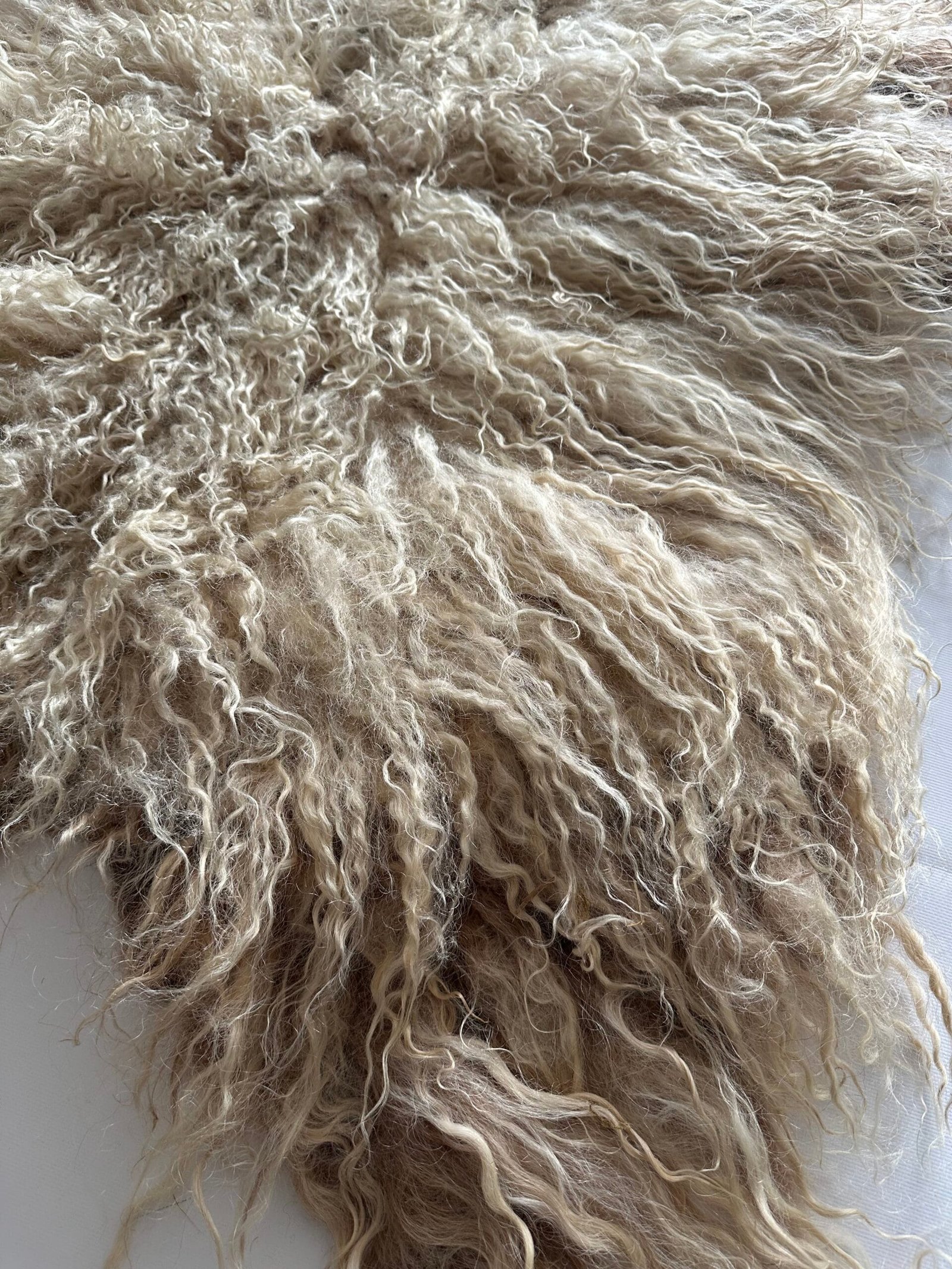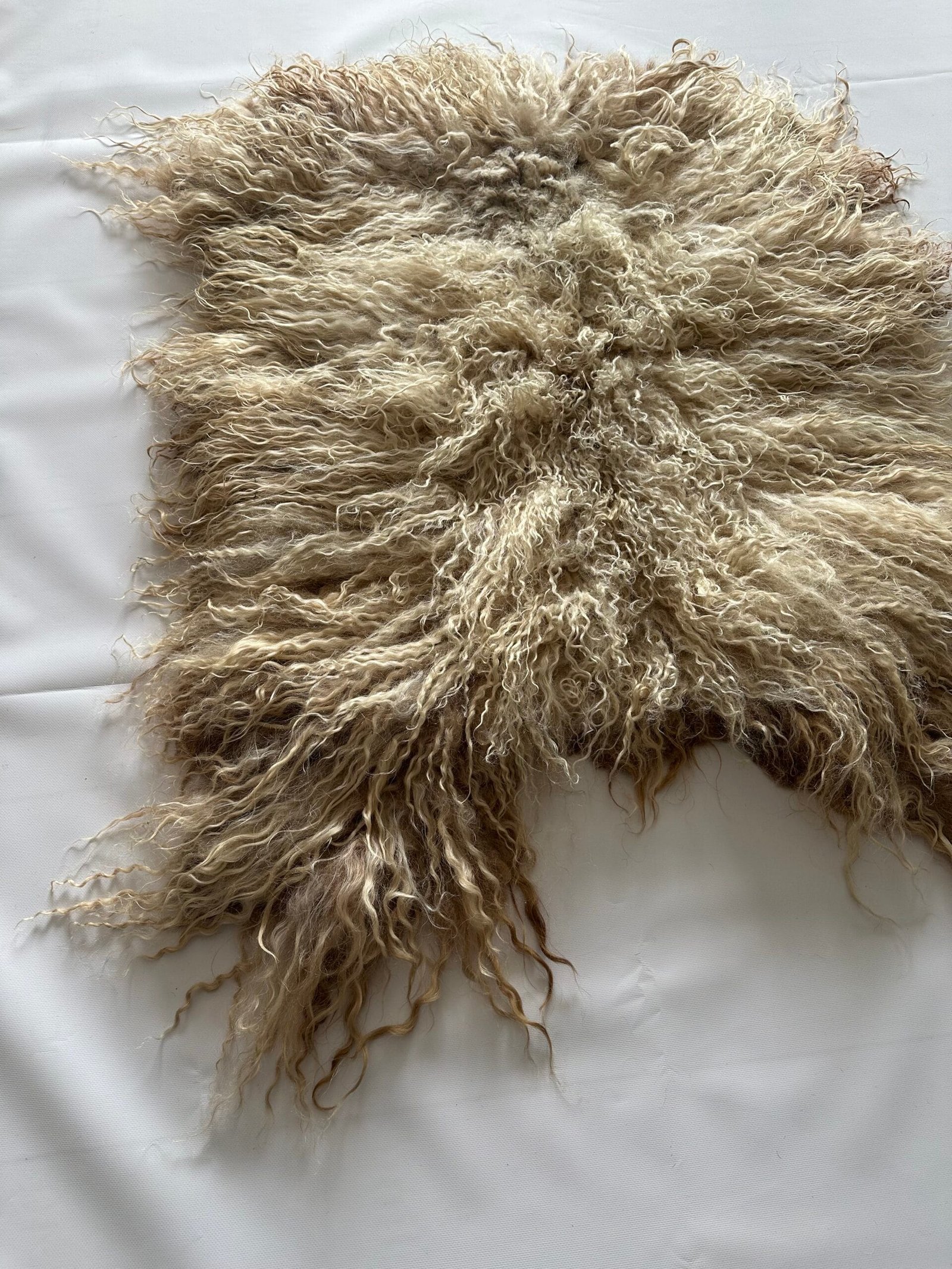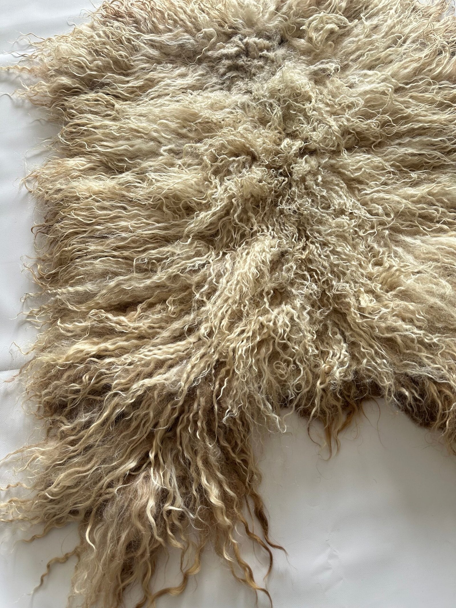 Een schapenvacht gevilt met de afgeschoren wol van een Norsk Spælsau schaap.