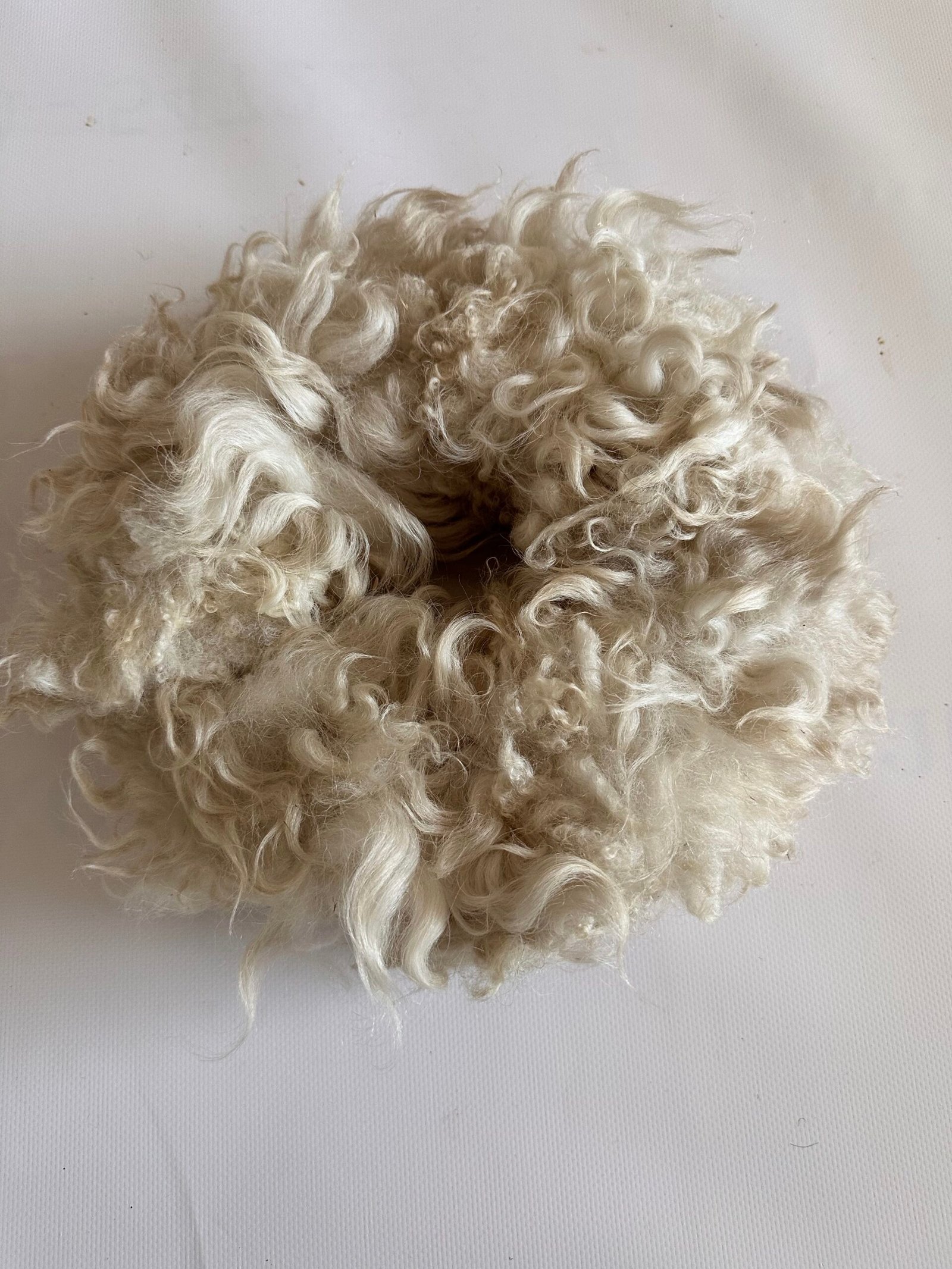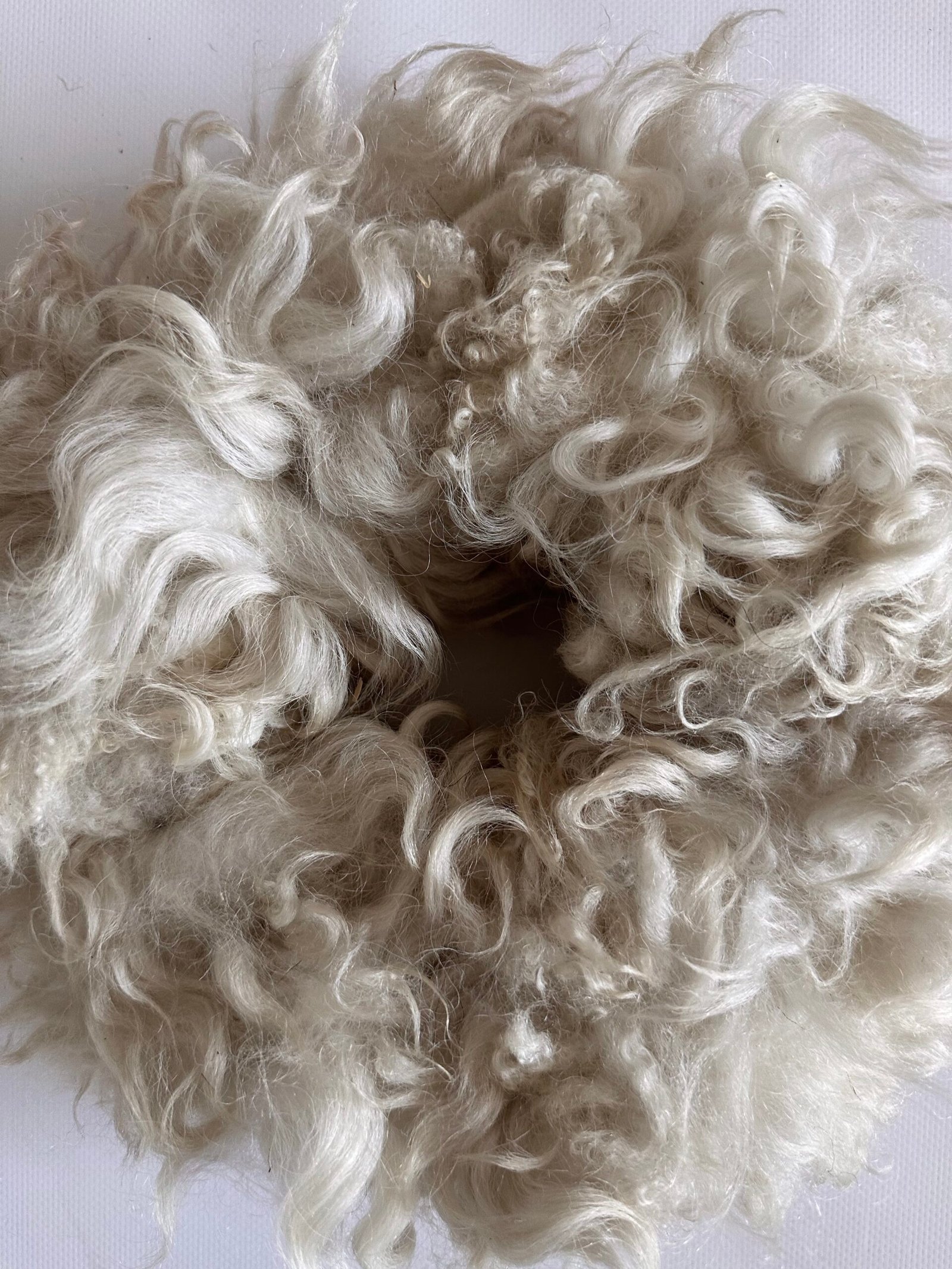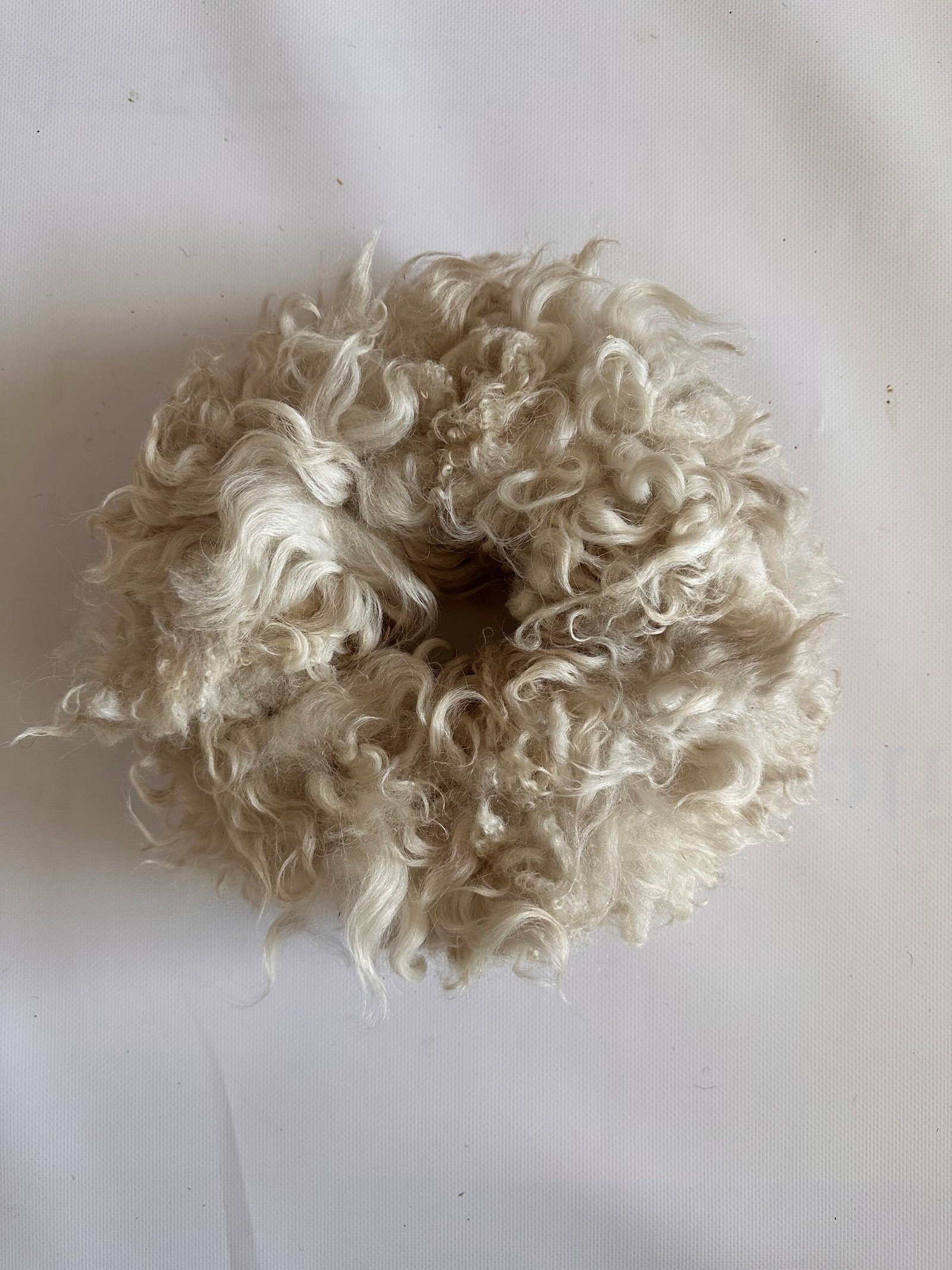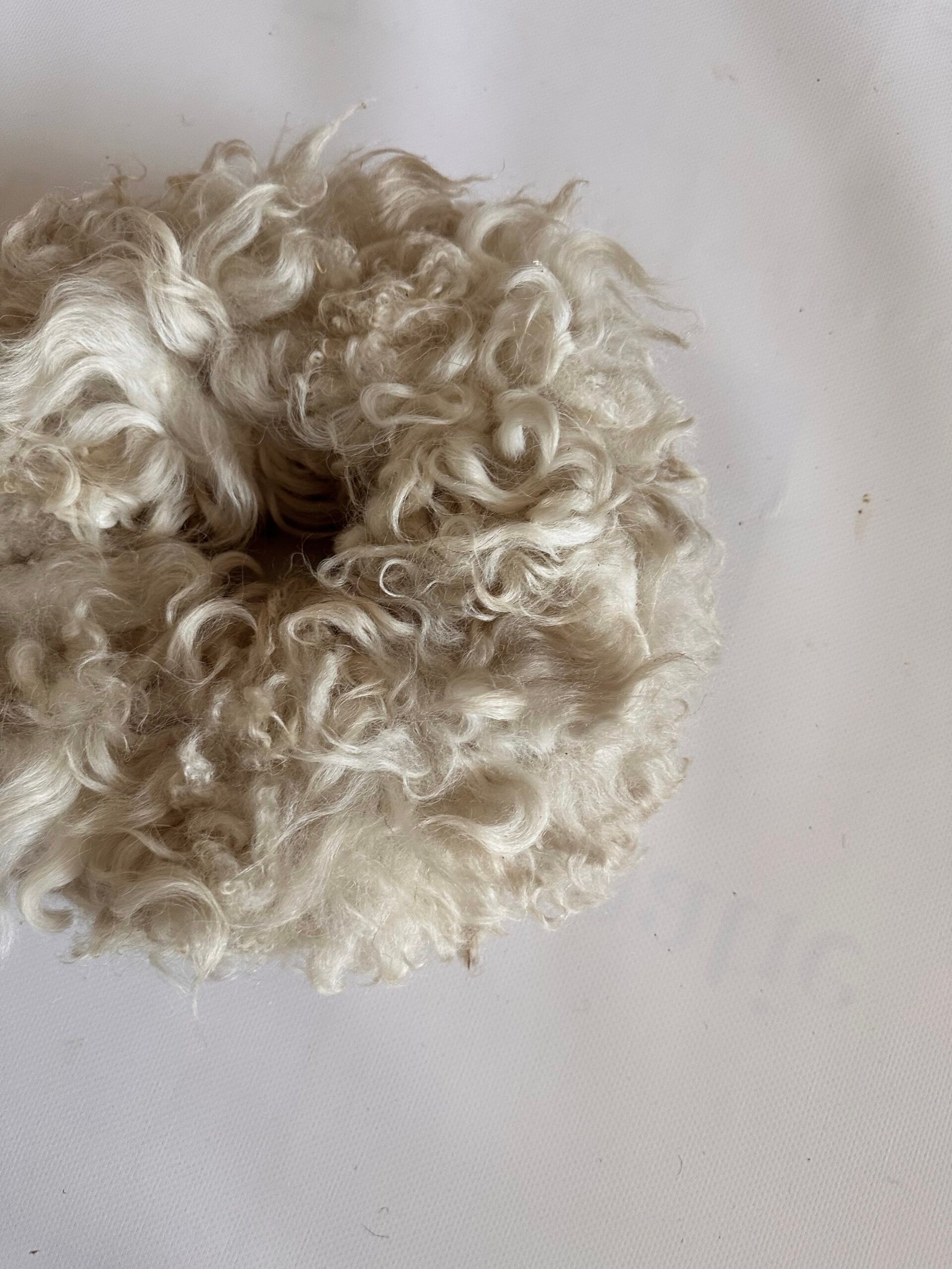 krans: 26 cm in de diamater. krullen wol van een kruising gotlande/heideschaap in een of white creme beige witte kleur.