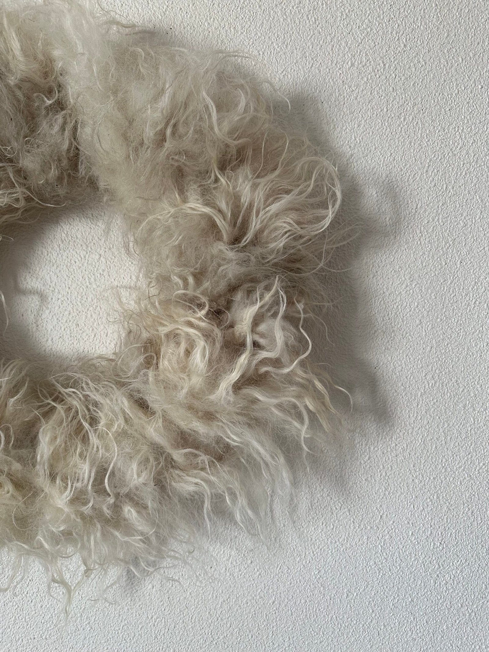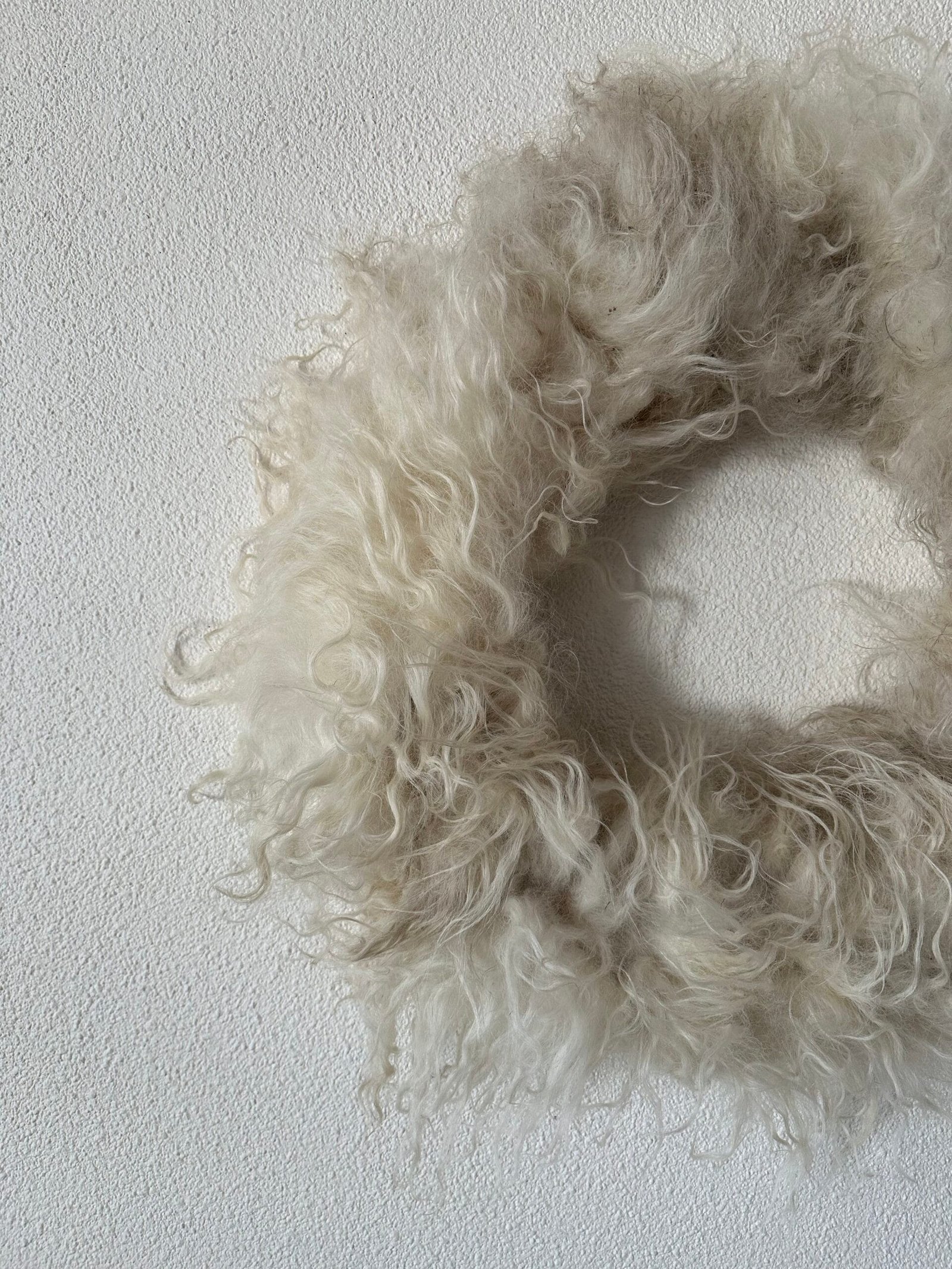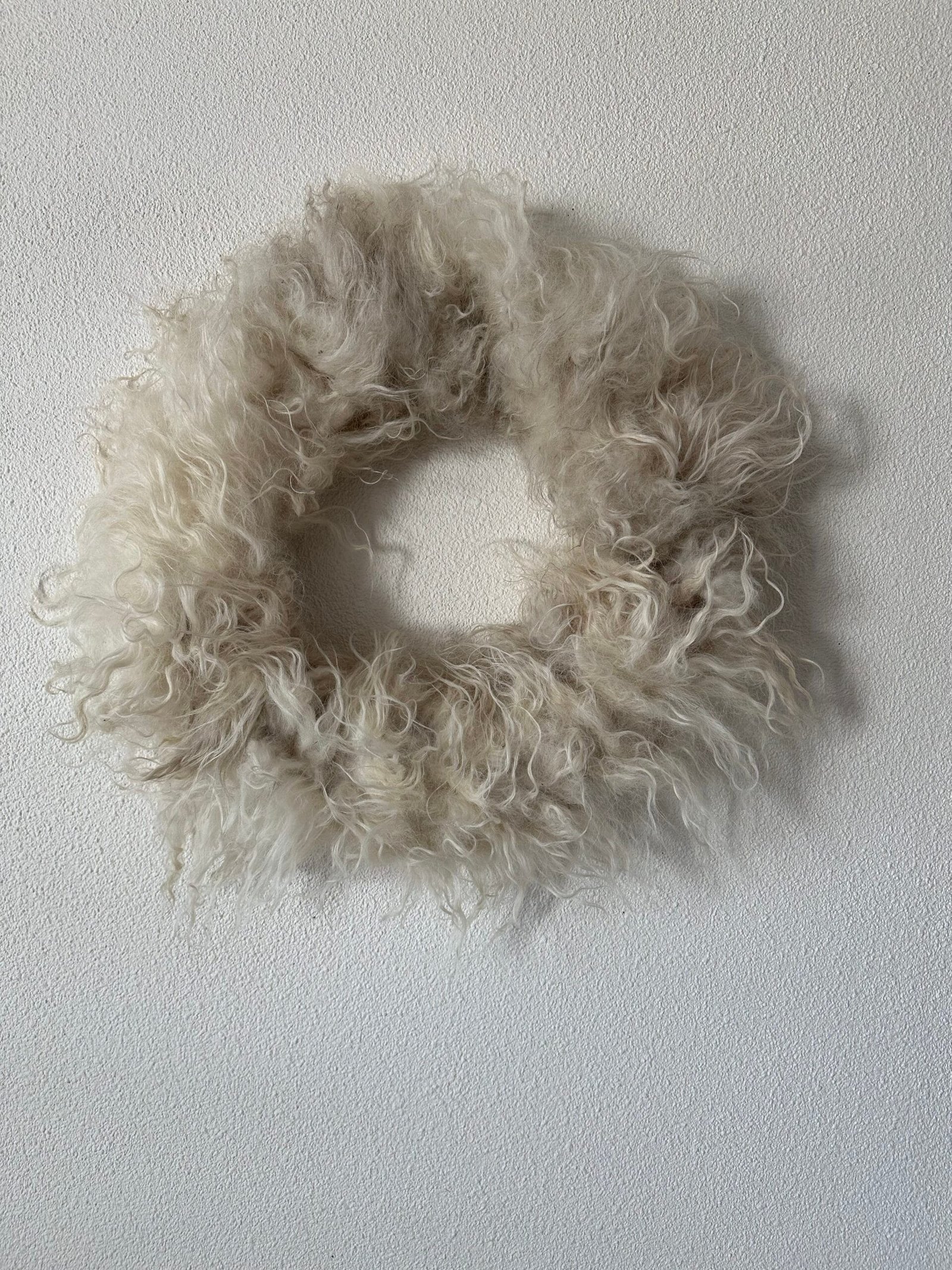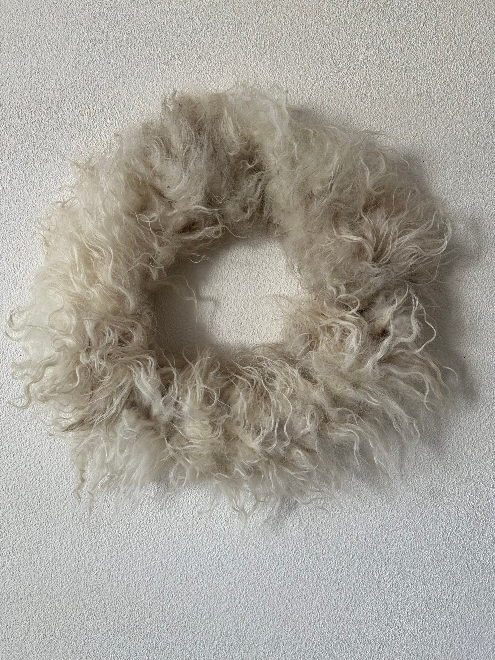 krans: 70 cm in de diamater. heideschapen wol in de kleur room wit iets grijs beige gloed.