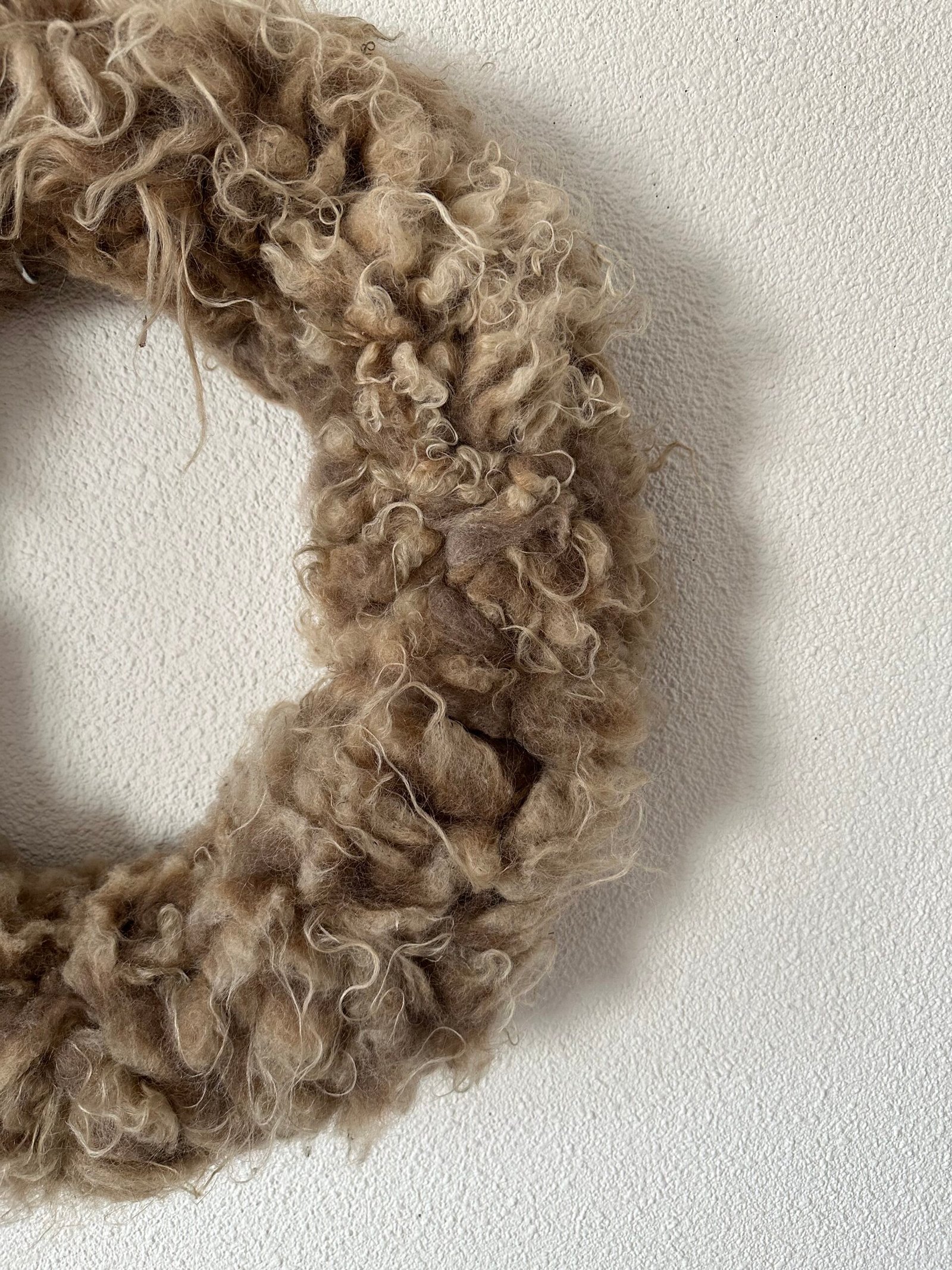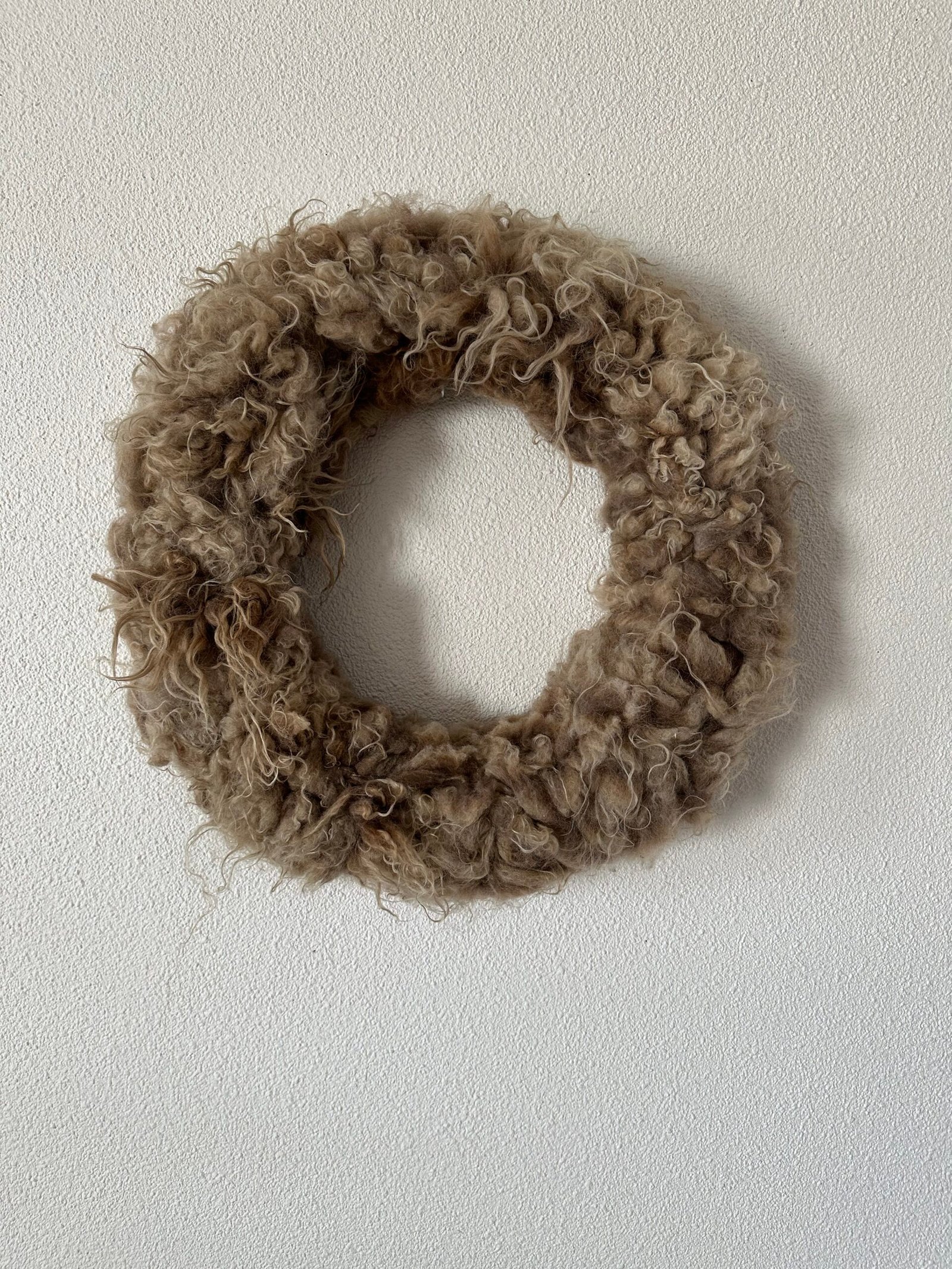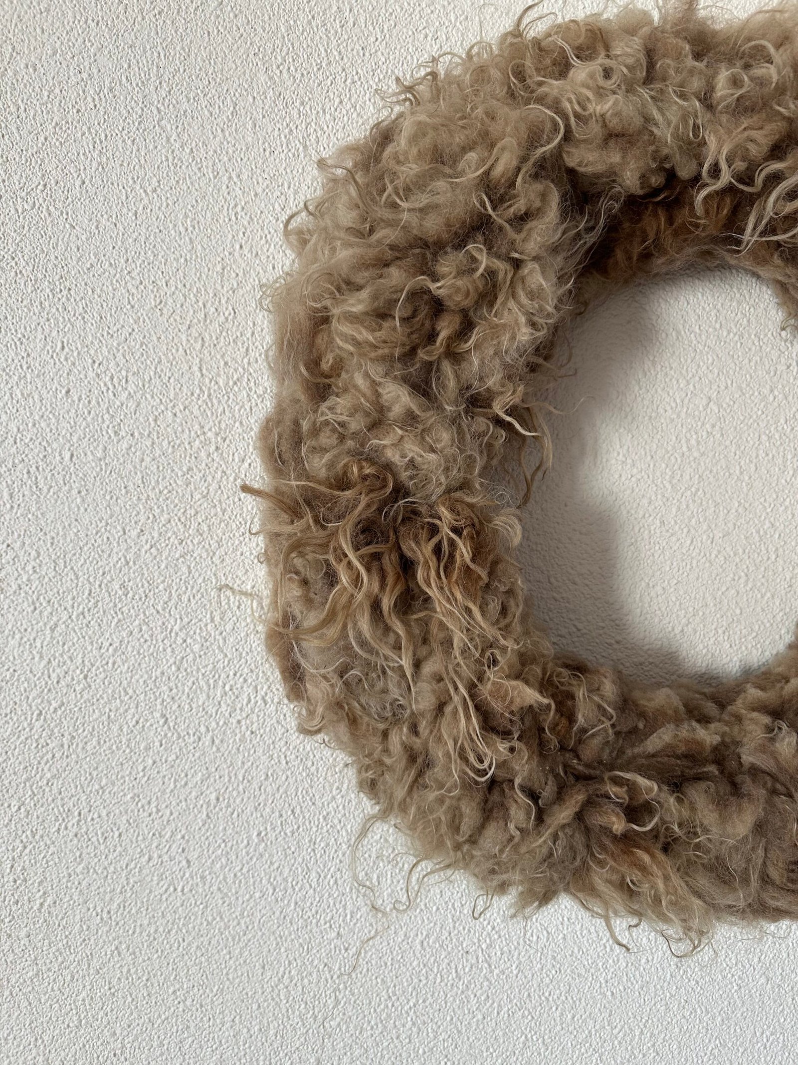 krans: 70 cm in de diamater. skuddeschapen wol in de kleur camel bruin.
