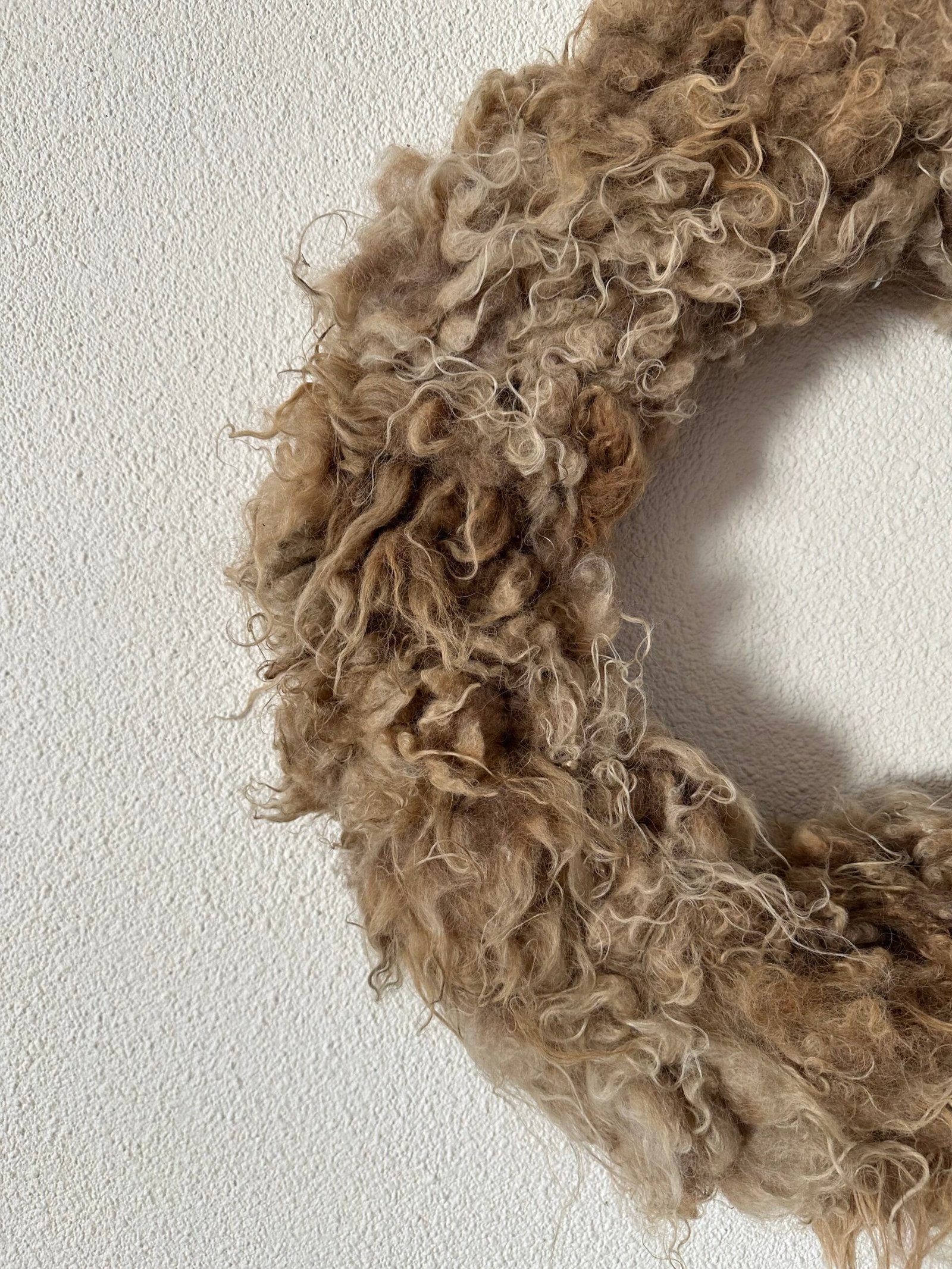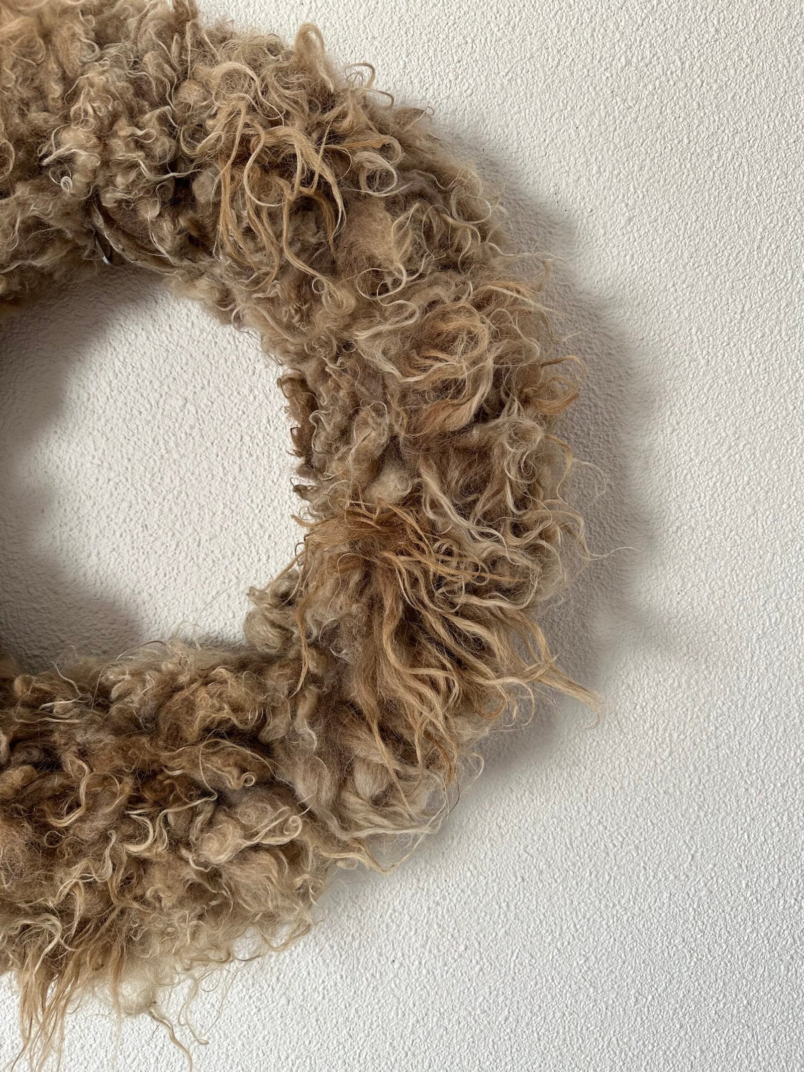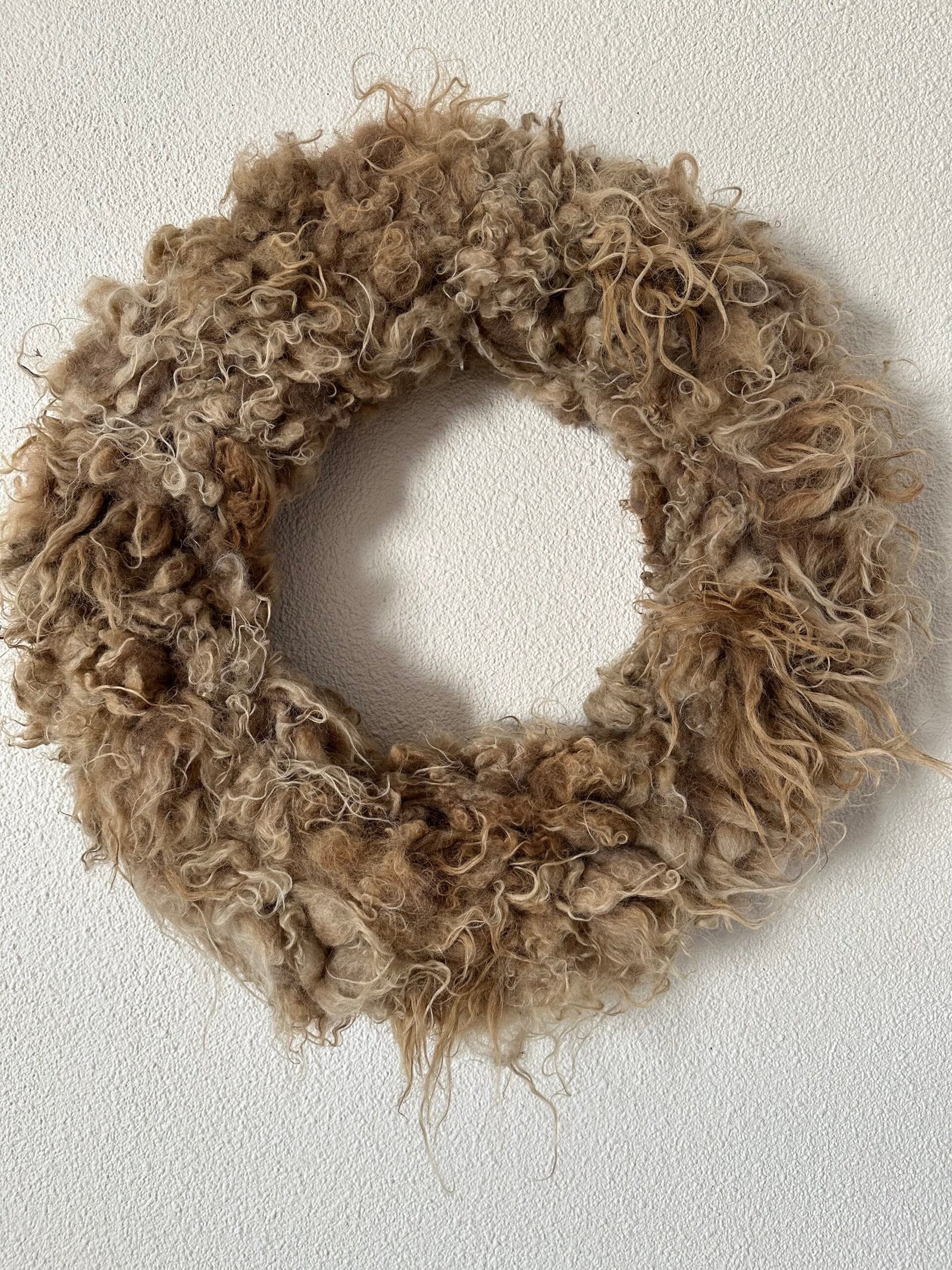 krans: 70 cm in de diamater. skuddeschapen wol in de kleur camel bruin.